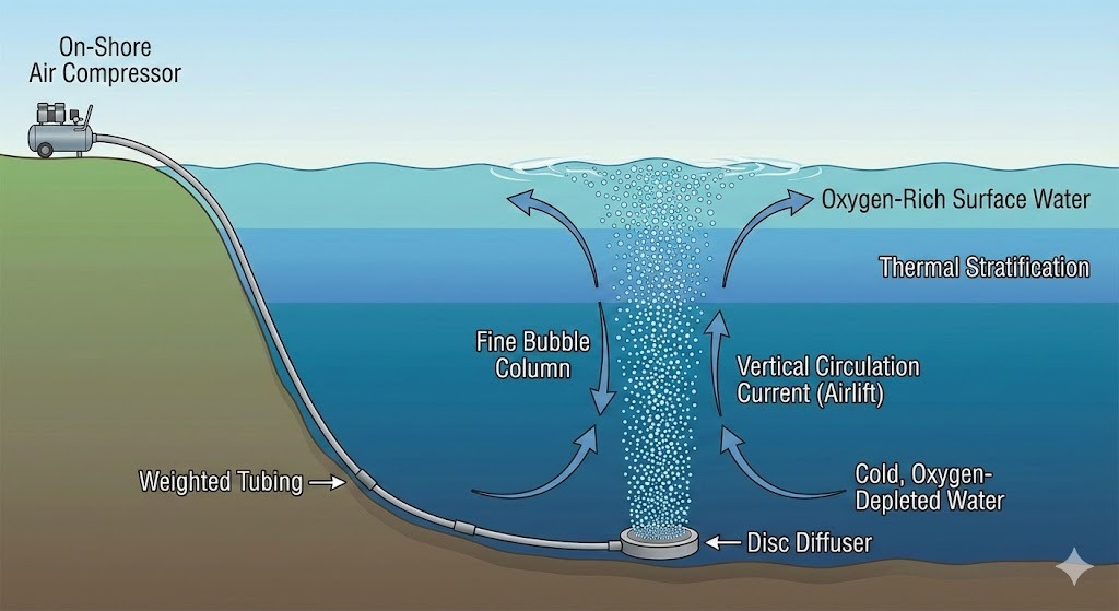 Nó hoạt động như thế nào: Khi các bong bóng nổi lên, chúng tạo ra hiệu ứng “nâng lên” gọi là lực nâng trên không. Điều này kéo nước thiếu oxy từ đáy lên bề mặt để tương tác với khí quyển, phá vỡ hiệu quả phân tầng nhiệt và oxy hóa đếnàn bộ cột nước.