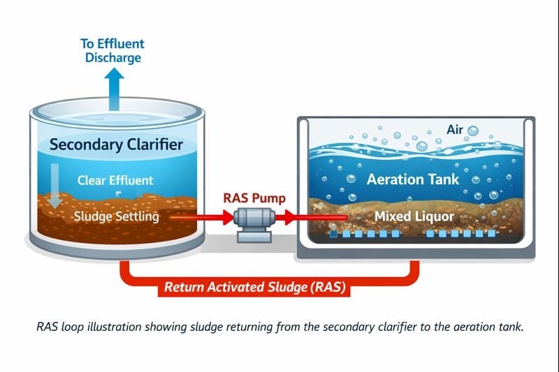 RAS (Return Activated Sludge) là quá trình đưa bùn hoạt tính đã lắng từ bể lắng thứ cấp trở lại bể phản ứng sinh học.